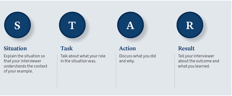 When you are answering an interview question, have a think about the STAR method (pictured below). This will help your answer to be well-structured, clear and concise.